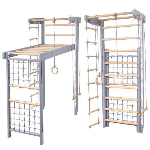 Komplet zawiera: drabinkę gimnastyczną z górnym drążkiem, rękochod, siatkę gladiatorską oraz zestaw linowy (kółka, lina, trapez, drabinka linowa). Dodatkowo można go uzupełnić o ścianę wspinaczkową, deskę do ćwiczeń brzucha, moduł Piklera, huśtawkę–dysk na linie oraz materac gimnastyczny.
