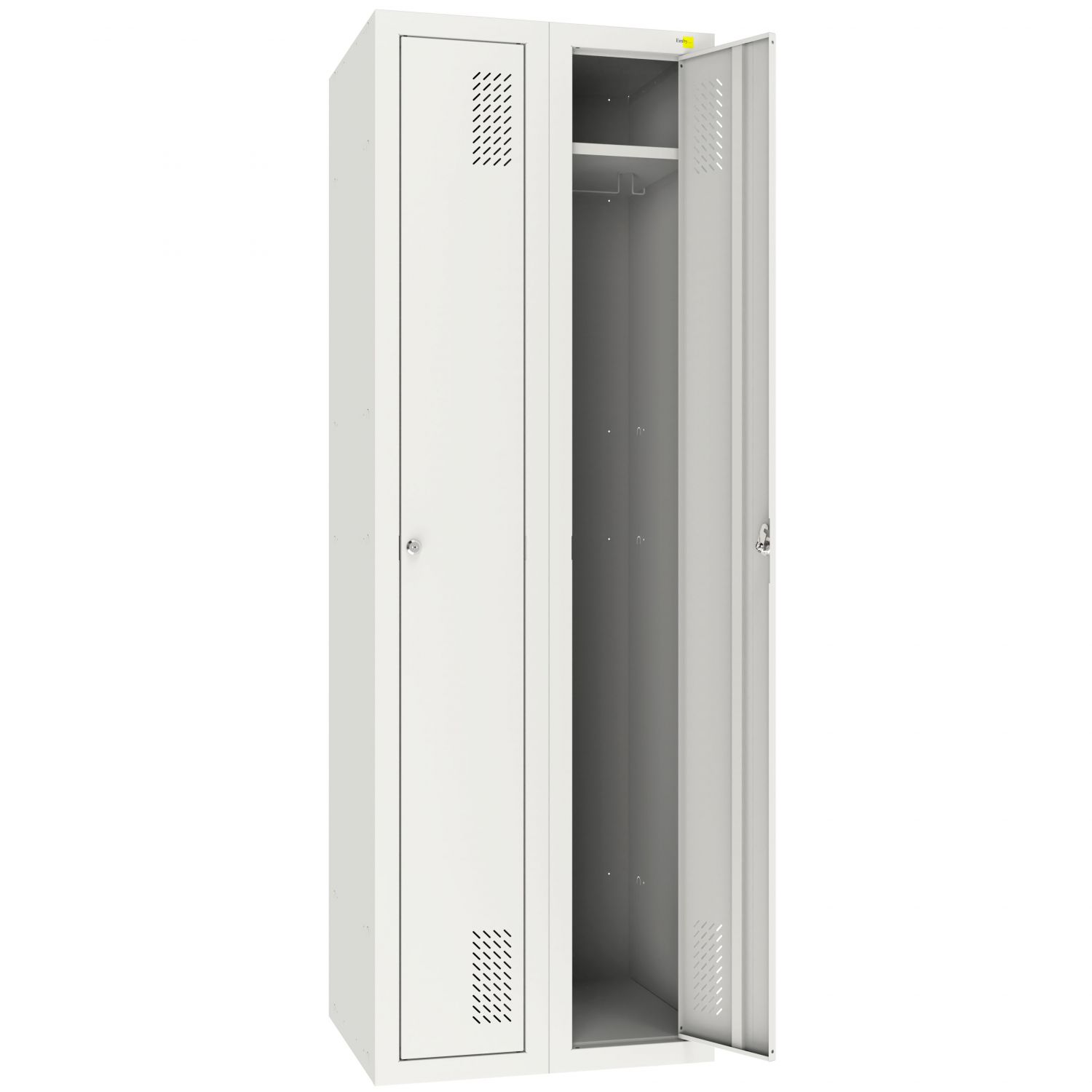 Solidna szafa wykonana z wysokiej jakości stali, odporna na korozję i uszkodzenia. Składa się z 2 sekcji z półkami, z których każda wyposażona jest w oddzielne drzwi oraz indywidualny zamek. Otwory wentylacyjne w drzwiach zapewniają cyrkulację powietrza i chronią przed wilgocią oraz nieprzyjemnymi zapachami. Idealna do biur, siłowni, szkół, zakładów produkcyjnych i innych miejsc publicznych, gdzie liczy się bezpieczeństwo i porządek.
