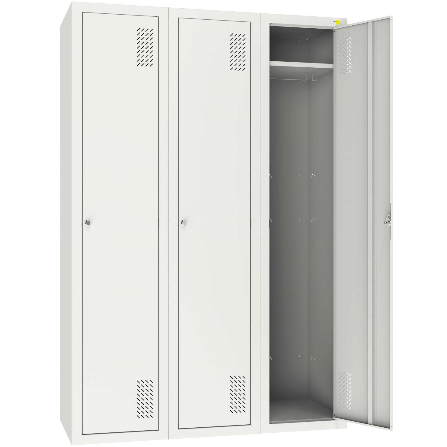 Solidna szafa wykonana z wysokiej jakości stali, odporna na korozję i uszkodzenia. Składa się z 3 sekcji z półkami, z których każda wyposażona jest w oddzielne drzwi oraz indywidualny zamek. Otwory wentylacyjne w drzwiach zapewniają cyrkulację powietrza i chronią przed wilgocią oraz nieprzyjemnymi zapachami. Idealna do biur, siłowni, szkół, zakładów produkcyjnych i innych miejsc publicznych, gdzie liczy się bezpieczeństwo i porządek.