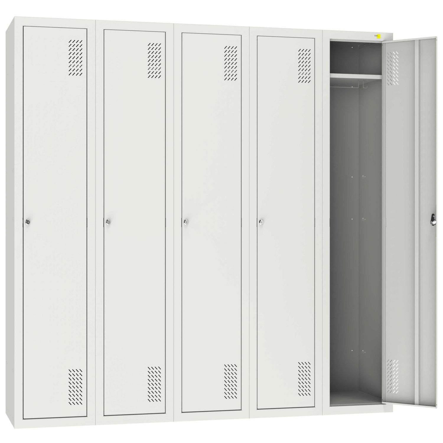 Solidna szafa wykonana z wysokiej jakości stali, odporna na korozję i uszkodzenia. Składa się z 5 sekcji z półkami, z których każda wyposażona jest w oddzielne drzwi oraz indywidualny zamek. Otwory wentylacyjne w drzwiach zapewniają cyrkulację powietrza i chronią przed wilgocią oraz nieprzyjemnymi zapachami. Idealna do biur, siłowni, szkół, zakładów produkcyjnych i innych miejsc publicznych, gdzie liczy się bezpieczeństwo i porządek.