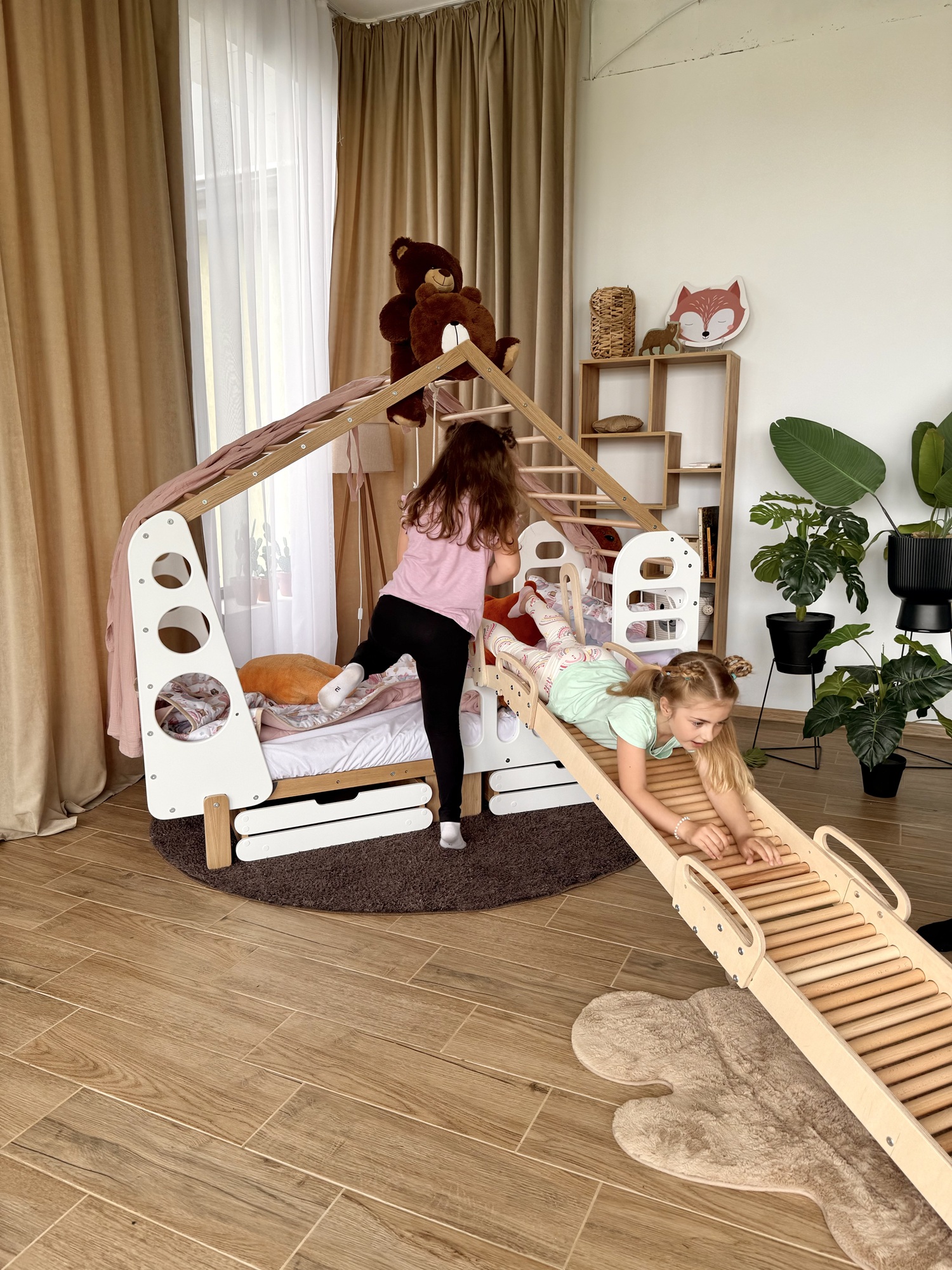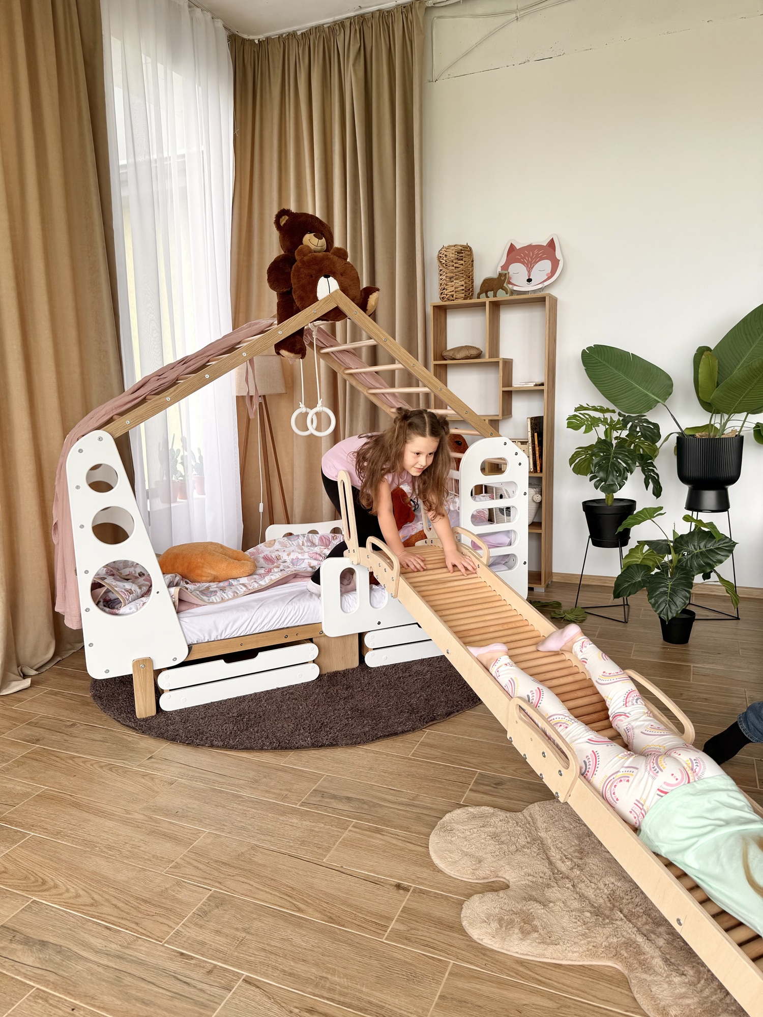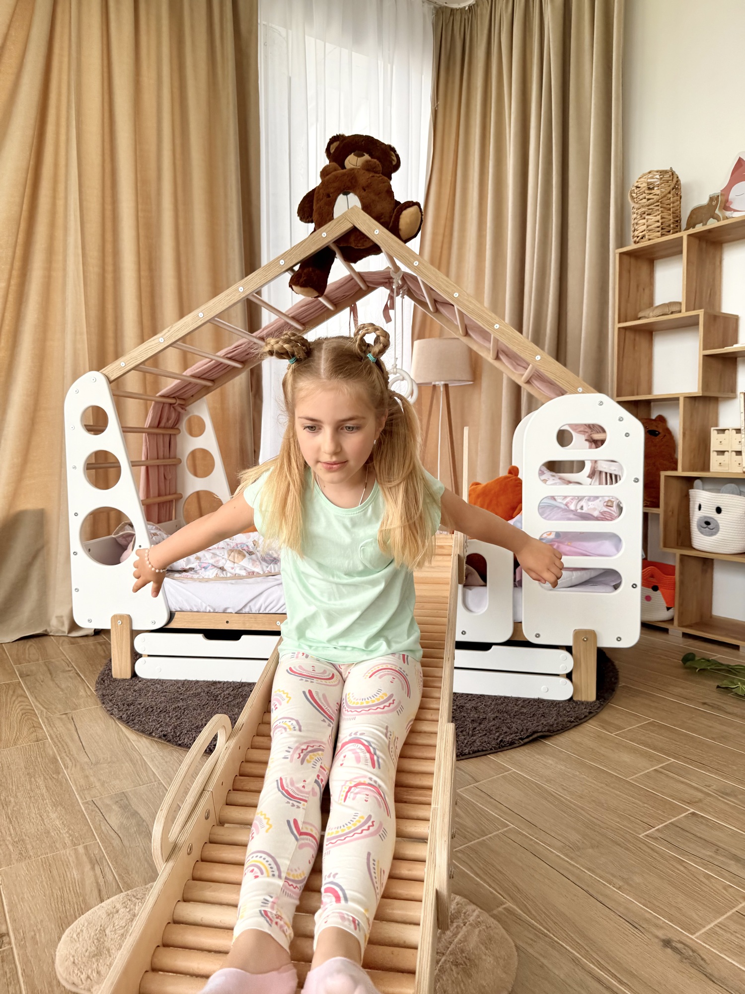 Miękkie rolki gwarantują płynny i bezpieczny zjazd, delikatny masaż stóp oraz wysoki komfort użytkowania. Regularne korzystanie ze zjeżdżalni wspiera rozwój koordynacji ruchowej, wzmacnia mięśnie nóg i tułowia oraz buduje pewność siebie.